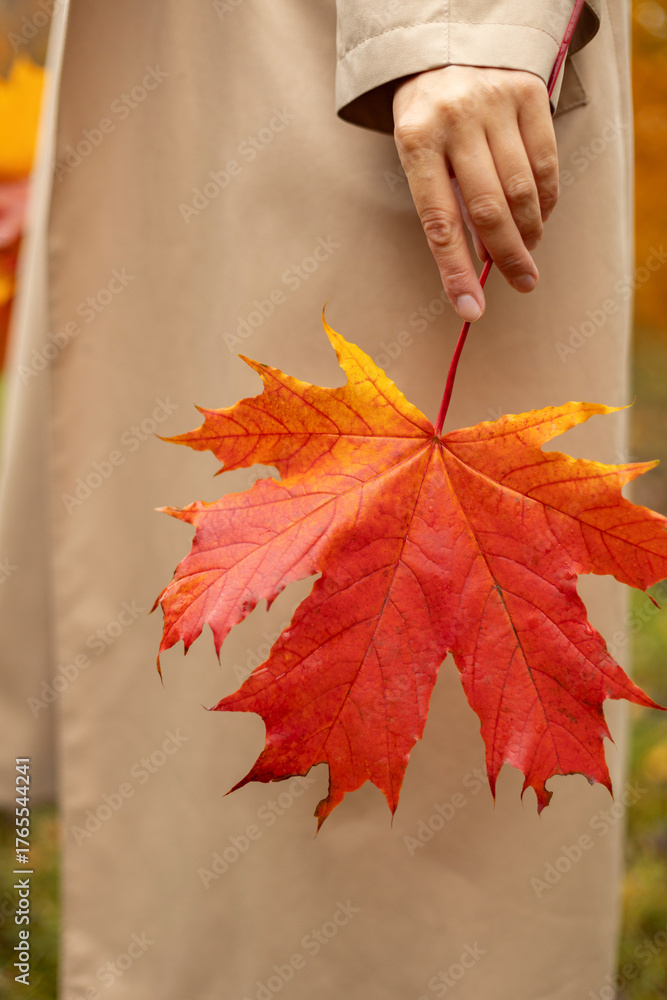 A large, beautiful, multi-colored maple leaf in a woman's hand, autumn mood