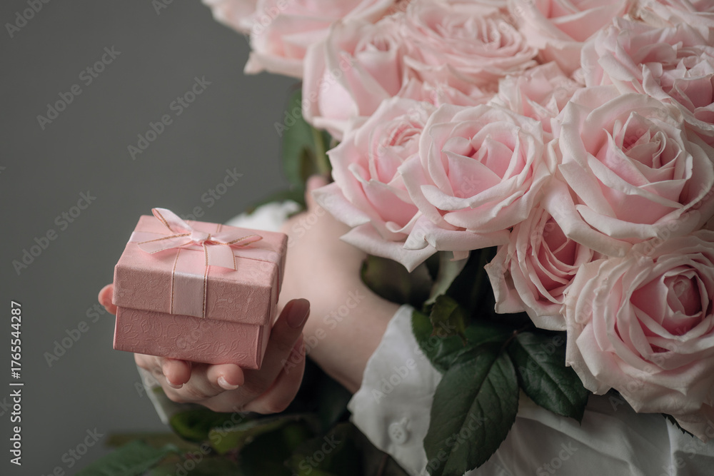 A beautiful bouquet of fresh roses and a small pink gift box in a woman's hands, flower delivery, marriage proposal