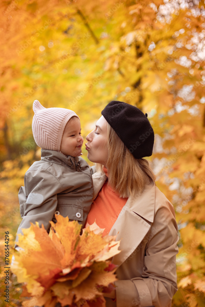 A young mother walks in an autumn park with her baby, enjoying a warm autumn day