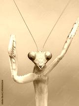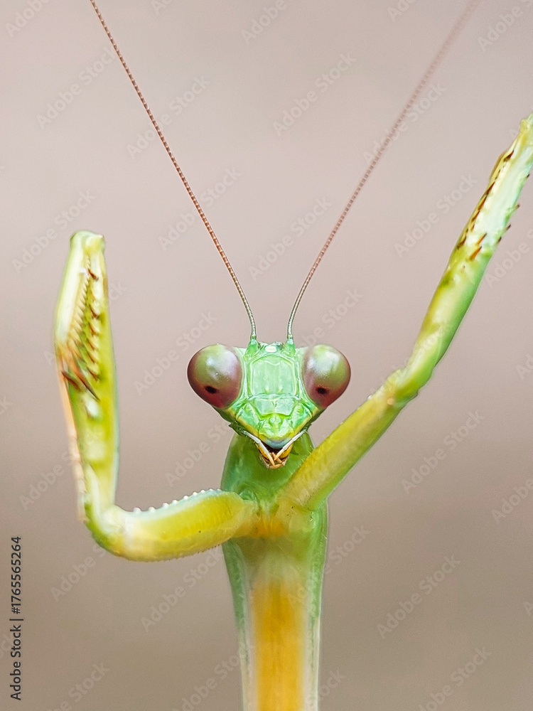 Close-up of a green praying mantis (Hierodula patellifera) raising its forelegs, showing detailed eyes and antennae.