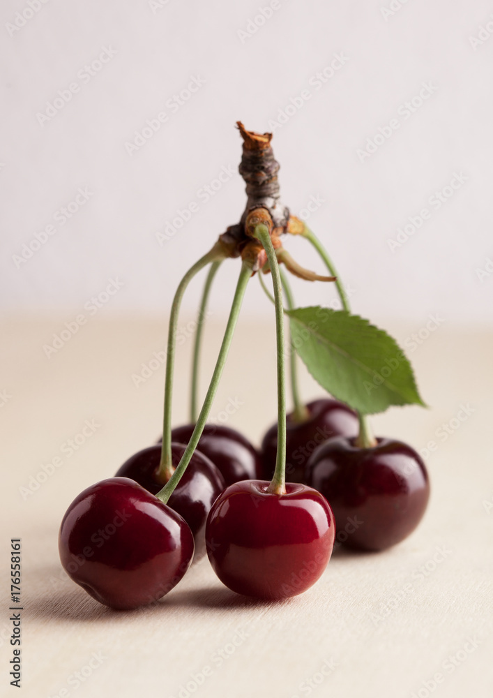 Cherry branch closeup with green leaf isolated on bright background in studio front view