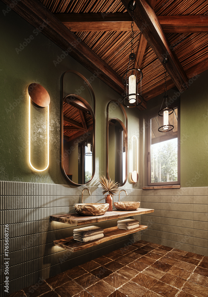 Contemporary bathroom interior design with green tiles and green walls. Modern bathroom. 3D Rendering, 3D Illustration