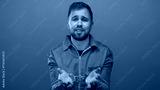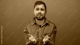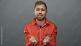Man in orange prisoner jumpsuit with visible handcuffs and hands held forward in gray studio; pleading remorse.