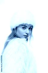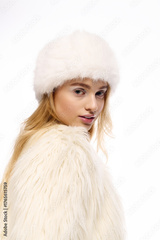 Blonde woman in cozy winter outfit and soft makeup against a white backdrop