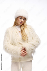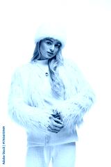 Captivating winter fashion featuring a young woman in cozy knitted outfit