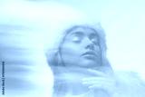 Young blonde woman in cozy winter attire with soft makeup in a serene indoor setting