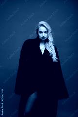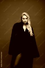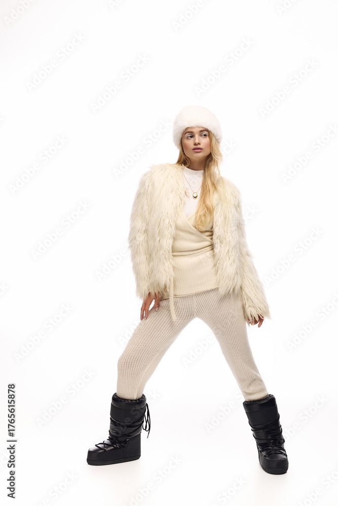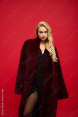 Young woman in a stylish red fur coat shines brightly during the winter season