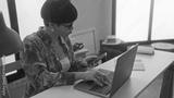 Woman working on laptop while checking smartphone in modern living room setting at home.