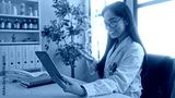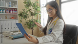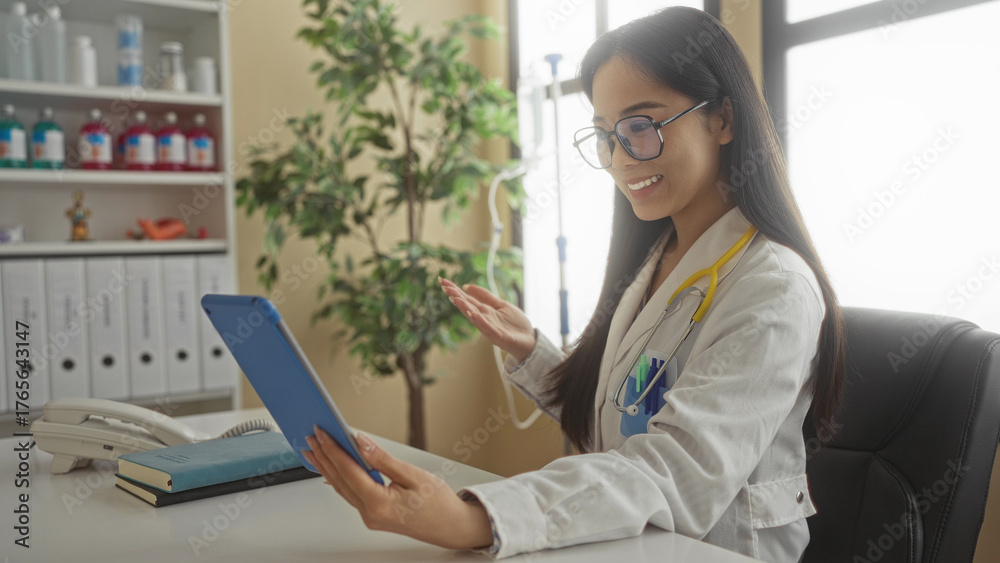 Doctor holding tablet during video call in hospital room, smiling warmly, surrounded by medical equipment and office furnishings, reflecting a professional healthcare environment.
