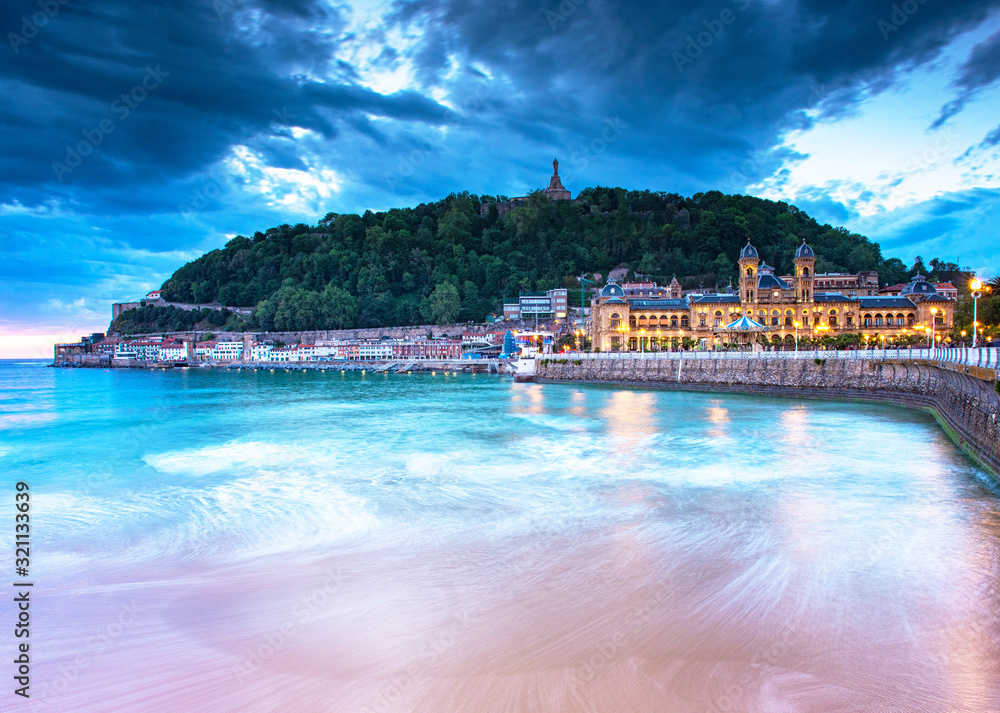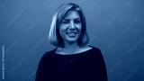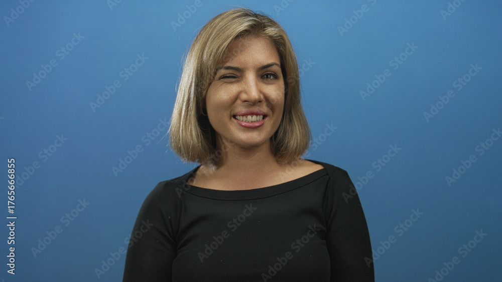 Woman face smiling in a blue studio wearing a black top and casual hair parted bob style portrait; serenity confidence warmth harmony.