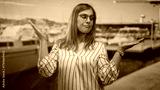 Woman shrugs with both hands open beside a docked boat at a sunny port; uncertainty hesitation doubt.