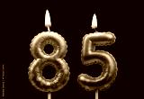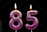 Burning air balloon shaped birthday candles with hearts isolated on black background, number 85