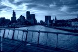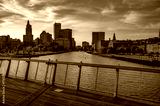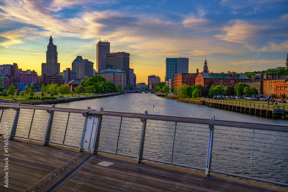 View of downtown Providence and the Providence River at colorful sunset, seen from a pedestrian footbridge in Rhode Island, USA.