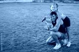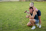 Playful and funny moment — sportive father and daughter hugging with badminton rackets. Authentic family bonding, summer leisure and joyful lifestyle concept