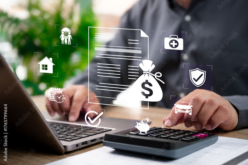 Insurance document, Financial Protection Concept, Businessman Reviewing Policy Documents, Calculating Premiums for Health, Home, and Travel Insurance, Medical Expense Planning, Compensation Coverage