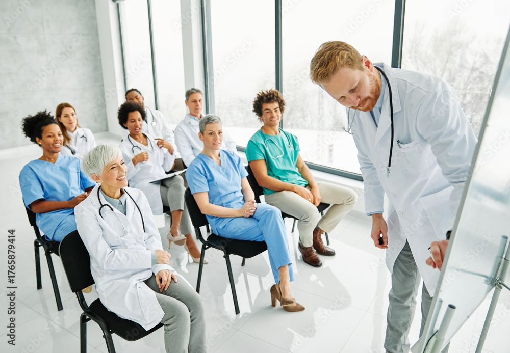 Portrait of a young doctor teaching on a seminar in a board room or during an educational class at convention center