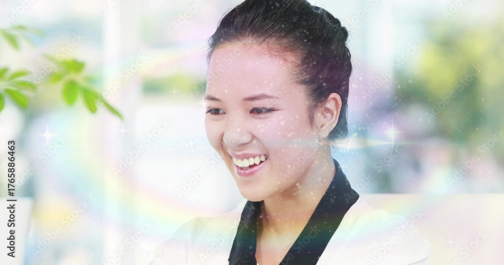 Smiling Asian woman wearing business attire posing in modern office with plants and pastel sparkles