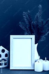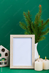 Mockup. Christmas. Empty wooden frame placed beside lit candles and evergreen branches in vase, accompanied by decorative house, creating cozy and inviting atmosphere for seasonal decor. Vertically