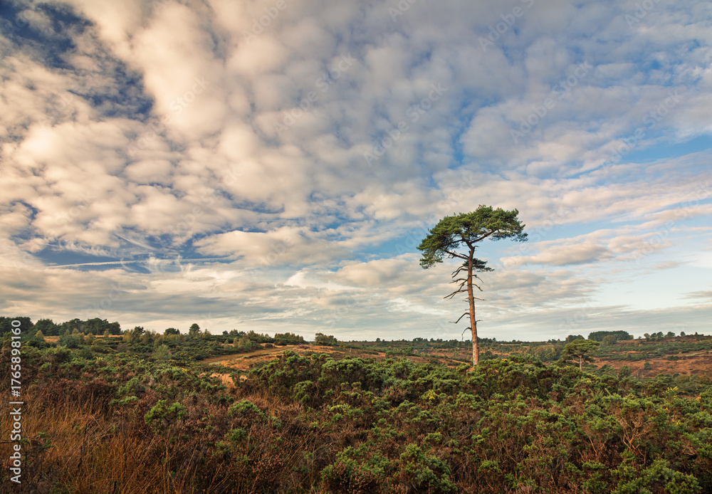 A lone scots pine stands in the heath land on the outskirts of 500 acre wood Ashdown forest on the high weald east Sussex, south east England UK
