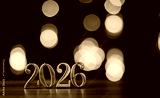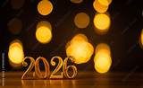 2026 3D numbers placed on a table with glowing bokeh lights in the background, New year resolution concept image