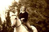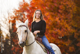 Young woman having great time with a horse in field on autumn season. sunset hour