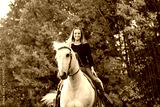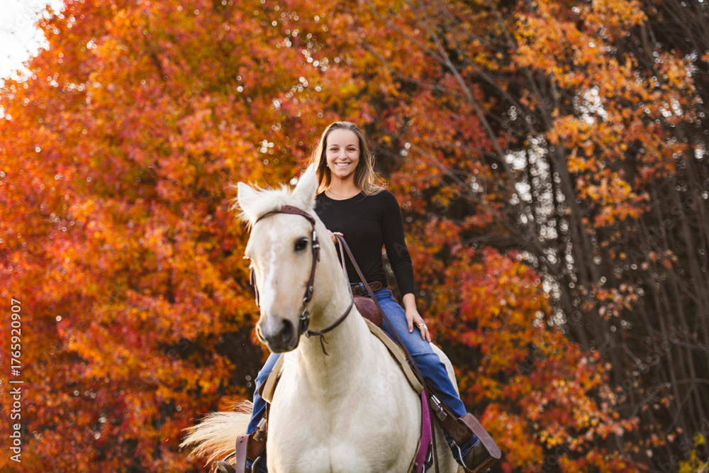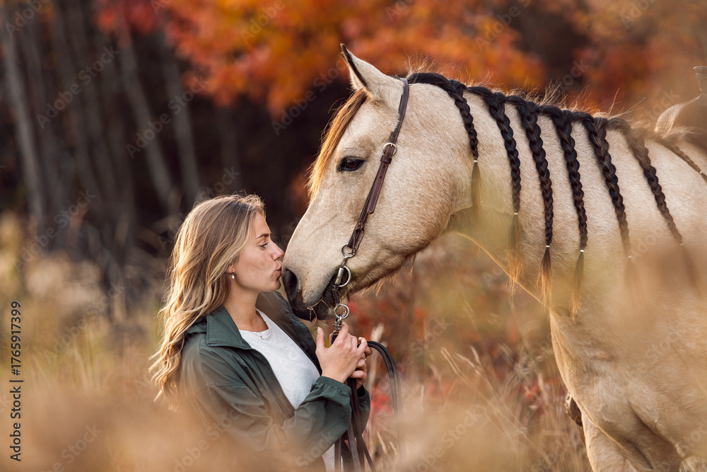 Young woman having great time with a horse in field on autumn season. sunset hour