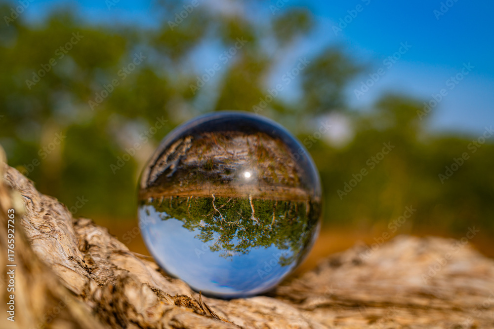 A creative photograph of a natural landscape reflected upside-down through a crystal ball placed on the ground, showcasing twisted tree trunks and greenery under a blue sky. Trees with unique beauty