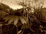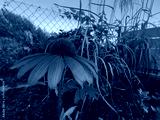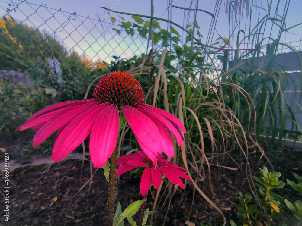 Wczesną jesienią na rabacie zakwitł piękny jaskraworóżowy kwiat jeżówki (Echinacea) z opadającymi płatkami i pomarańczowym, centralnym kwiatostanem na rabacie. Okolica porośnięta jest trawą .