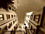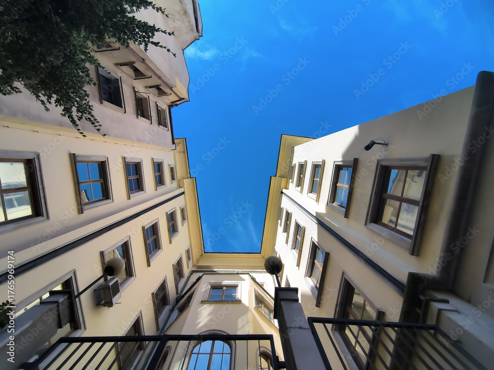 Spojrzenie w górę na fasadę starej, zabytkowej kamienicy, obramowanej czystym, błękitnym niebem. Budynek wyróżnia się wieloma oknami z ciemnymi ramami, osadzonymi w jasnych ścianach.