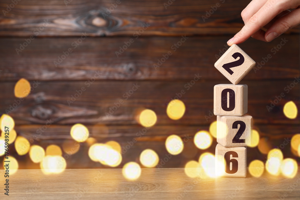New 2026 Year. Woman putting cube with number 2 onto others on table, closeup
