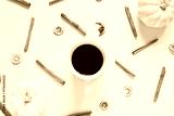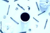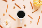 Flat lay style of autumn and thanksgiving concept with coffee, pumpkins and cinnamon sticks on pastel color, top view