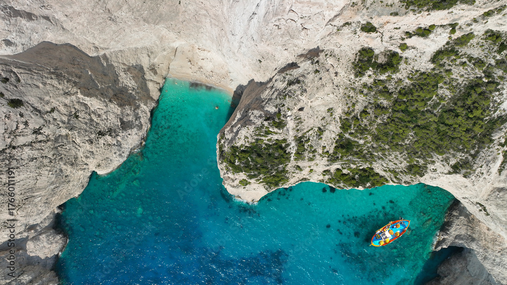 Aerial drone photo of famous steep rocky white cliffs creating beautiful coves and turquiose sea caves of Kampi visited by small boats and yachts in northern part of Zakinthos island, Ionian, Greece