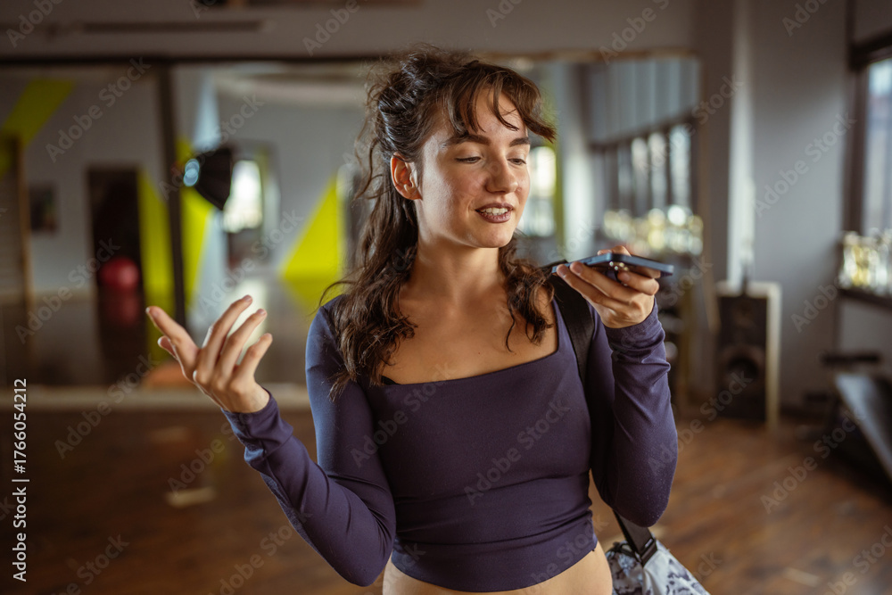 Woman sending voice message with phone in gym