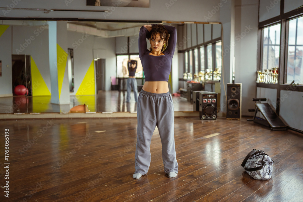 Young woman dancer stretching in dance studio