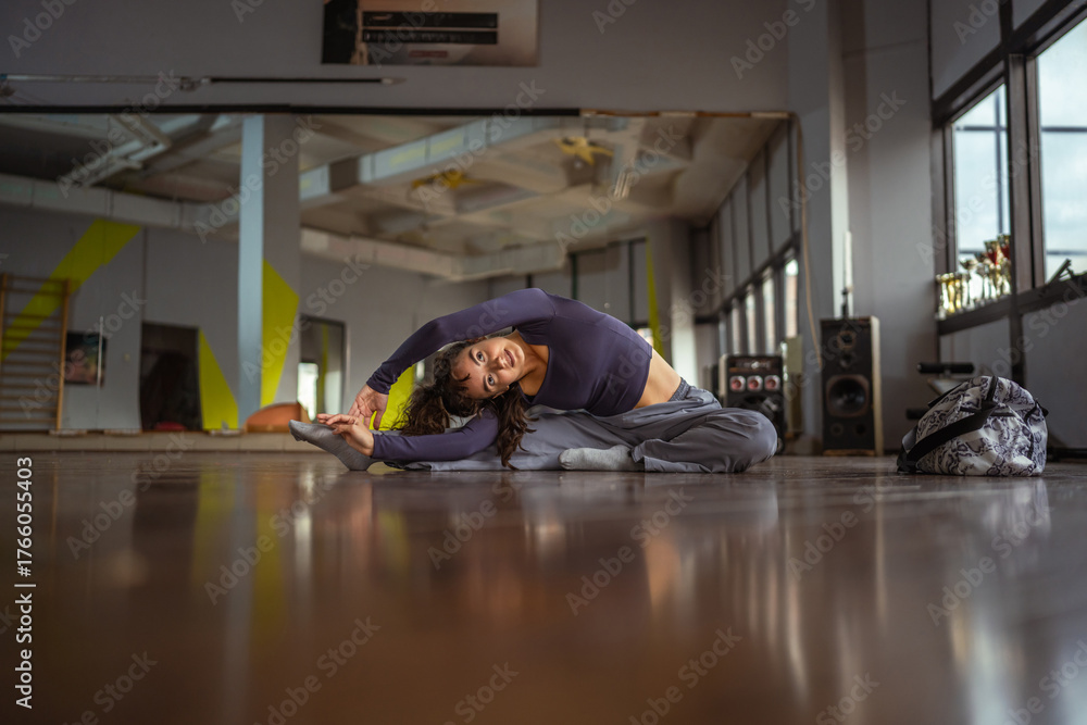 Young dancer stretching leg in dance studio