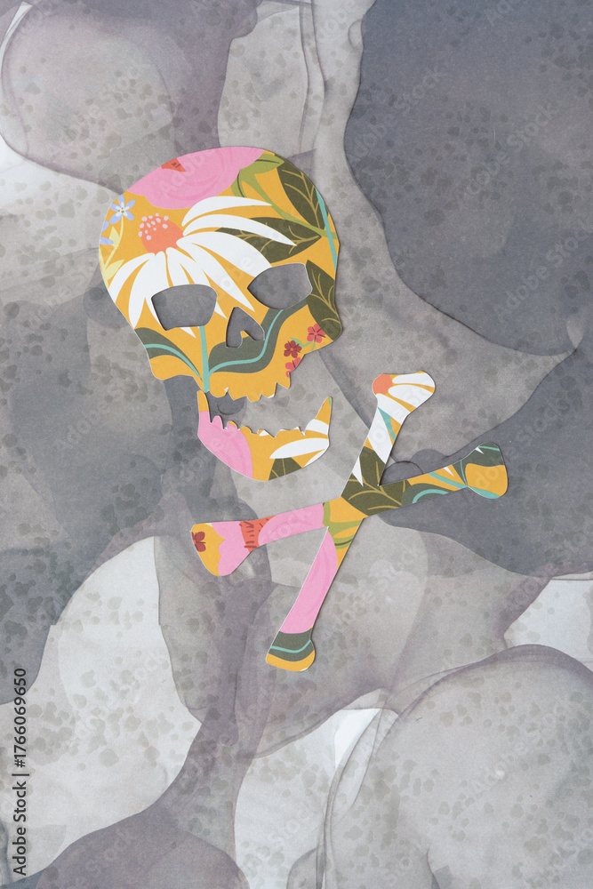 skull and crossbones machine-cut from bold floral paper arranged on gray dark ink scrapbook paper (halftone print)