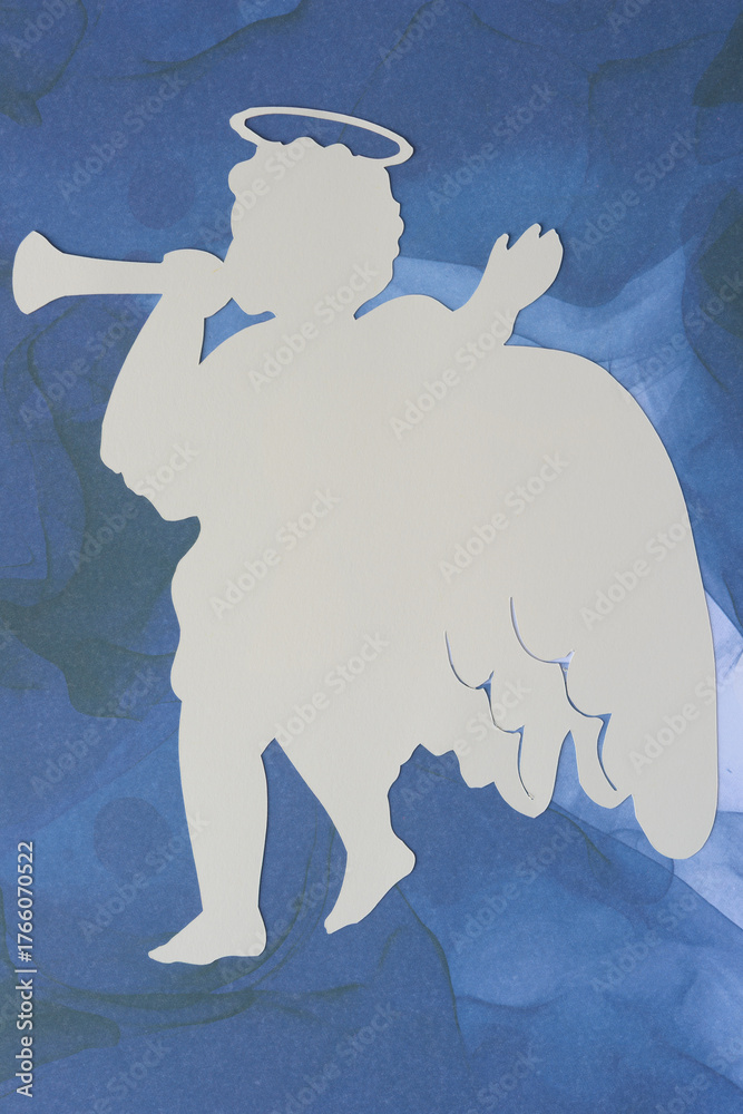 silhouette of an angel with trumpet on a deep blue dark ink scrapbook paper (halftone print)