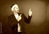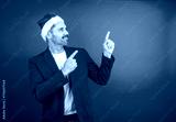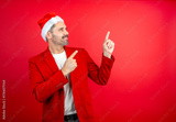 Man wearing santa hat and red blazer pointing to copy space