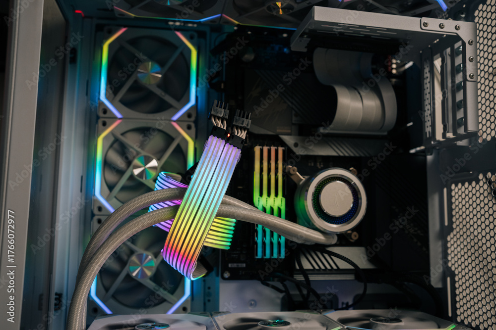 Rainbow-colored cables illuminate interior of custom-built gaming computer, showcasing vibrant RGB lighting and high-performance components, close-up, nobody. Concept of modern technology.