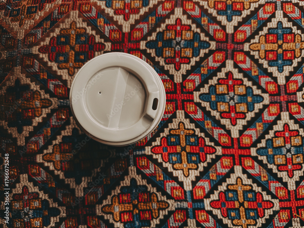 Stylish minimalist composition - a coffee to go cup lid on a vibrant ethnic patterned rug. Warm cozy atmosphere, slow living, morning coffee, boho aesthetic, autumn vibes, lifestyle inspiration.