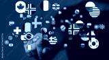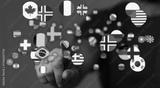 Hand interacting with floating flags representing different countries, symbolizes global connectivity, international relations and technology.