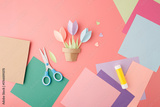 Color paper flower pot craft with glue and scissors on pink background, useful for educational content, arts marketing, early childhood branding and creative DIY tutorials,