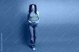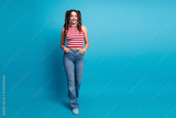 Attractive young woman in trendy casual outfit posing against vibrant blue background showcasing her cheerful style