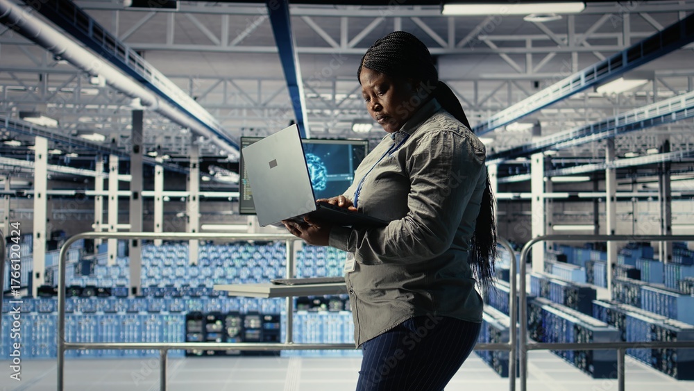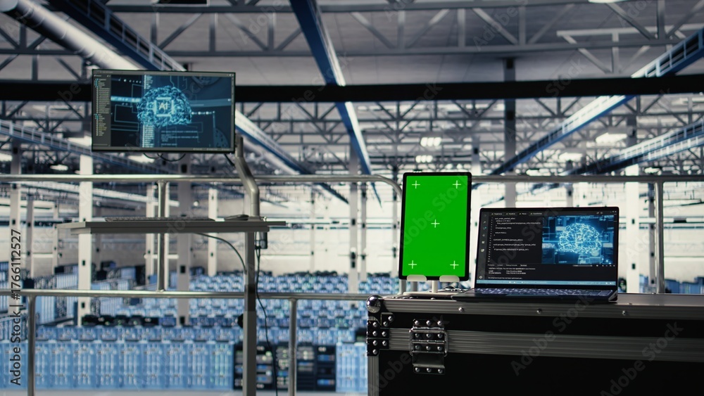 Green screen tablet in server room with machine learning technology detecting data patterns. Chroma key device in data center ensuring rapid data access and transfer rates for AI processing
