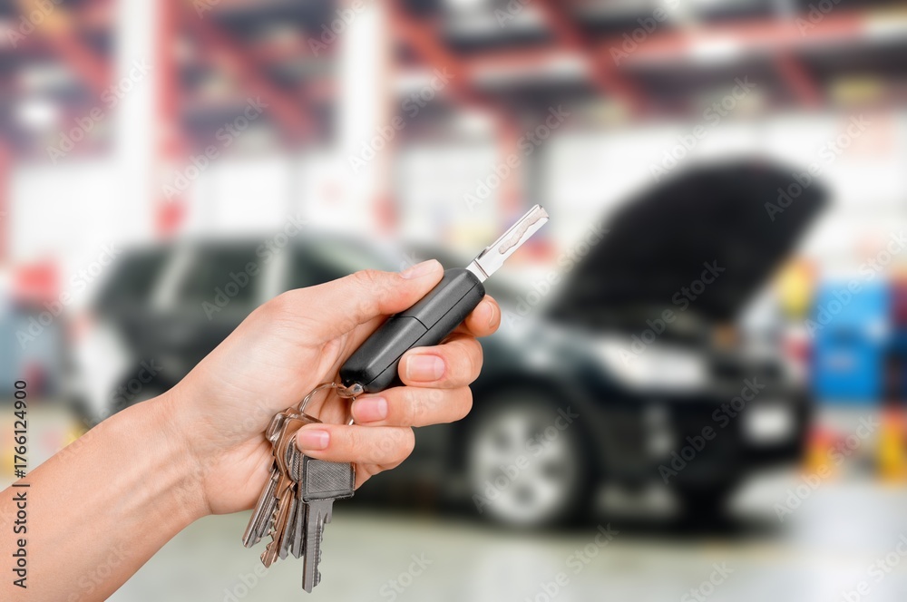 Young man hand hold car key on car background