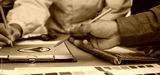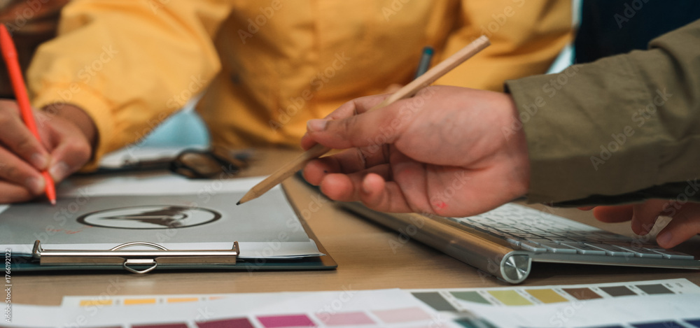 A vibrant collaborative workspace showcases diverse hands engaged in creative discussions. Color swatches and design sheets reflect an innovative atmosphere of teamwork and inspiration. SACTR