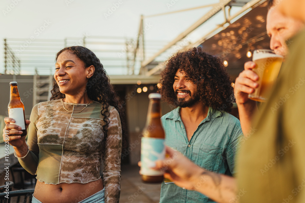 A group of friends share a relaxed moment on a rooftop as they hold bottles and glasses of beer, smiling and chatting while enjoying the warm evening light.