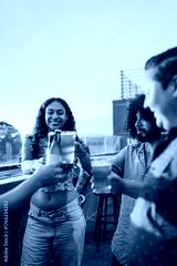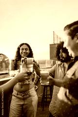 A cheerful group of friends clinks their beers and glasses in a toast on a rooftop at sunset. The scene radiates warmth, connection, and celebration,.