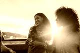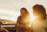 Two friends share a laugh while enjoying drinks on a rooftop at sunset