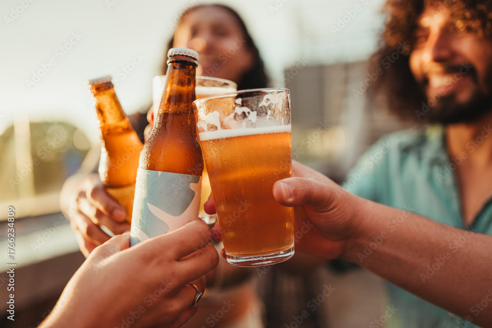 Close-up of friends clinking beer bottles and glasses during golden hour on a rooftop.
